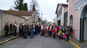 L'autre quart, soit une cinquantaine de personnes dont des enfants de 5 ans, empruntent le parcours des 10 km en passant devant l'ancienne ferme de Burniqueville avec quelques gouttes de pluie, puis Montigny où la municipalité nous a accueillis chaleureusement avec un ravitaillement bien garni.