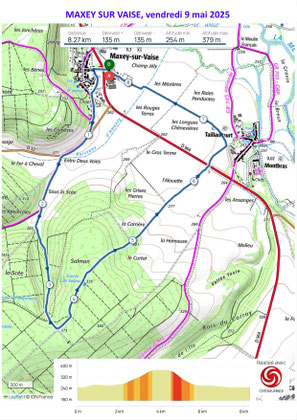 Puis nous montons dans le Bois de la Scée presque jusqu’à la Source de Salmon. Puis nous descendons parmi les cytises. Sortant du bois nous apprécions les nuances de vert des cultures qui moutonnent sous le vent. Le paysage s’étend à Taillancourt, la Blanche Côte, Champougny, Sepvigny et au-delà. Nous continuons en plaine jusqu’à Taillancourt. Un coup d’œil au château de Montbras et nous obliquons au niveau du cimetière sans s’attarder pour voir le monument du XIXème dit de l’Etudiant représentant un jeune homme assis, sa caquette sur les genoux, un livre ouvert à la main. Nous revenons à Maxey sur l’ancienne voie ferrée par les Longues Chènevières.